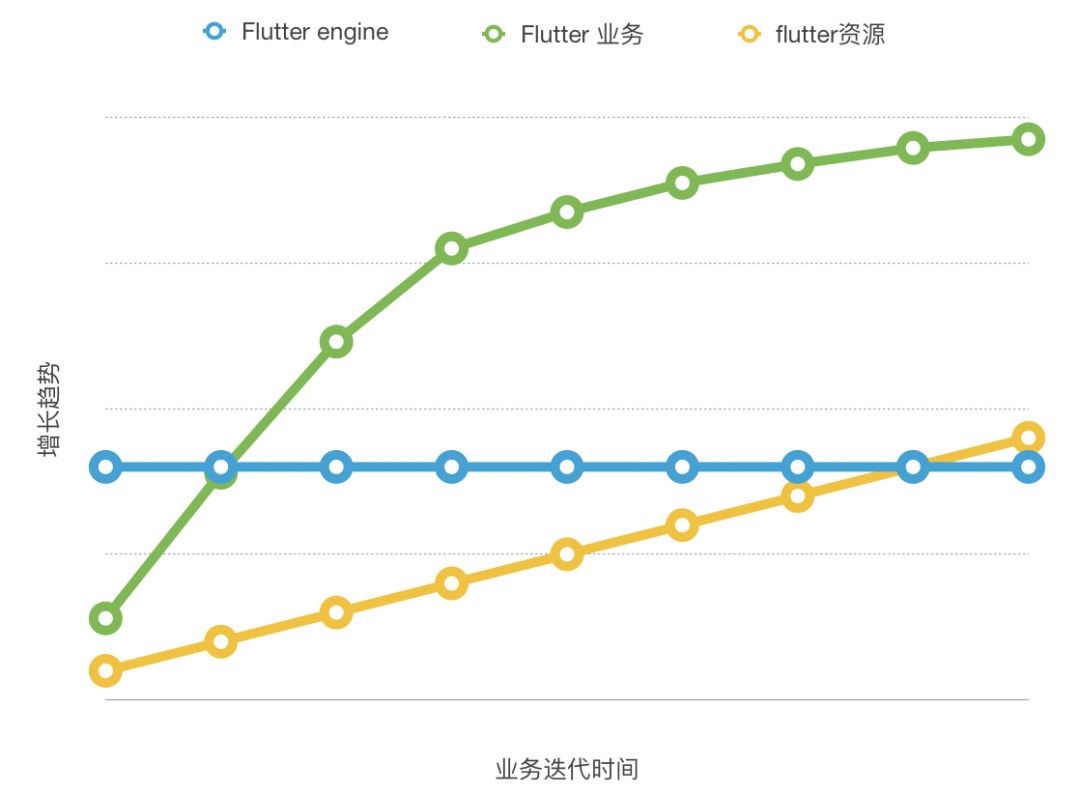 Flutter资源,该部分初始占比较小,后期增长主要取决于用到的本地图片资源的多少,增长趋势与资源多少成正比。
