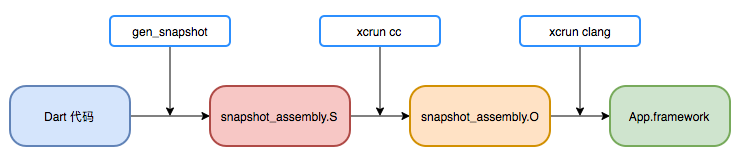 到这里,其实我们就可以得到iOS侧Flutter包大小的优化方案:将flutter_assets、icudtl.dat等静态资源及kDartVmSnapshotData、kDartIsolateSnapshotData两部分在编译时拆分出去,通过动态下发的方式来实现包大小的缩减。但此方案有个问题,kDartVmSnapshotData、kDartIsolateSnapshotData是在编译时就写入到App中了,如何实现自动化地把此部分拆分出去是一个待解决的问题。为了解决此问题,我们需要先了解kDartVmSnapshotData、kDartIsolateSnapshotData的写入时机。接下来,我们通过下图6来简单地介绍一下该过程: