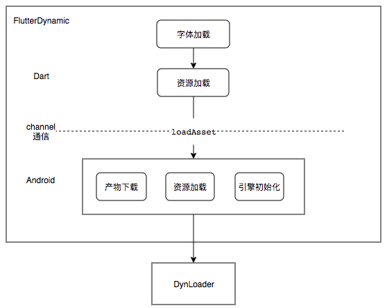 整个方案的运行时部分涉及多个功能模块,包括产物下载、引擎初始化、资源加载和字体加载,既有Native侧的逻辑,也有Dart侧的逻辑。如何将这些模块合理的加以整合呢?平台团队的同学给了很好的答案,并将其实现为一个Flutter Plugin:flutter_dynamic(美团内部库)。其整体分为Dart侧和Android侧两部分,Dart侧提供字体和资源加载方法,方法内部通过method channel调到Android侧,在Android侧基于DynLoader提供的接口实现产物下载和资源加载的逻辑。