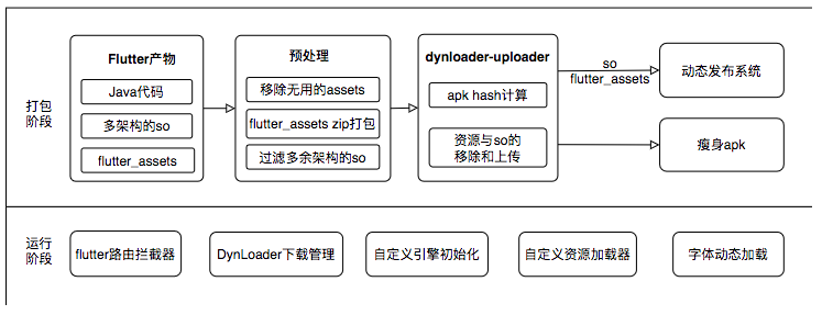 虽然我们不能把App.framework及Flutter.framework通过动态下发的方式完全拆分出去,但可以剥离出部分非安装时必须的产物资源,通过动态下发的方式来达到Flutter包体积缩减的目的,因此在该阶段主要工作包括三部分。