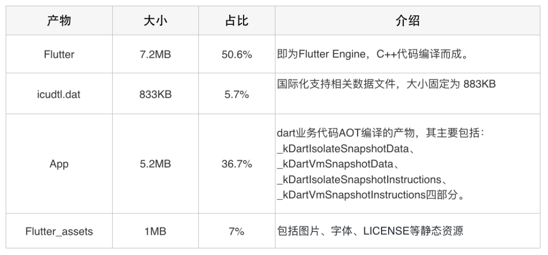 iOS侧的Flutter产物主要由四部分组成(info.plist 比较小,对包体积的影响可忽略,这里不作为重点介绍),表格1中列出了各部分的详细信息。