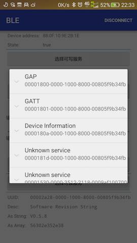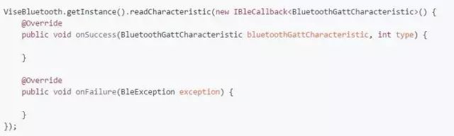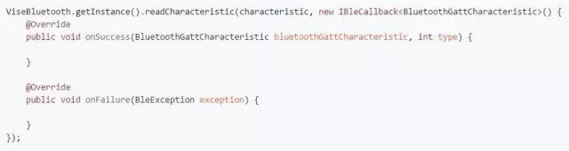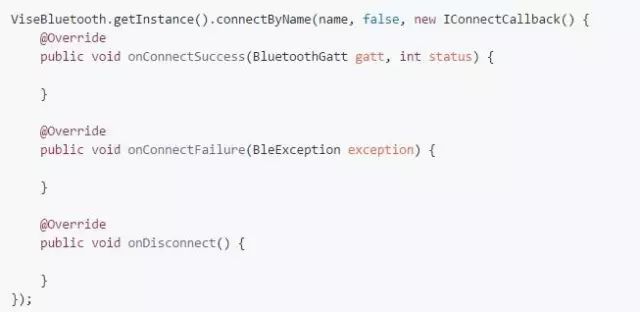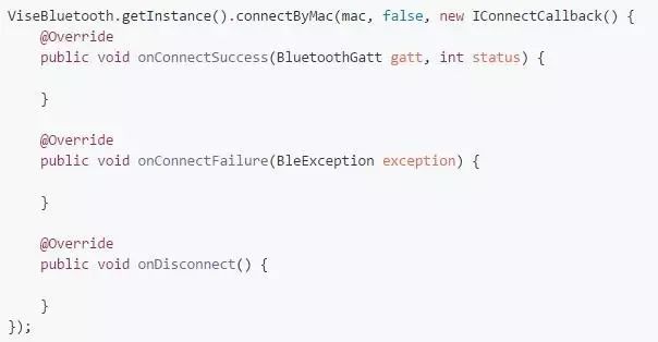 连接成功后就可以进行相关处理,回调已在底层做了线程切换处理,可以直接操作视图。如果知道该设备服务的UUID,可直接调用 ViseBluetooth.getInstance().withUUIDString(serviceUUID, characteristicUUID, descriptorUUID); ,那么在下面操作设备时就不需要传特征 (BluetoothGattCharacteristic) 和描述 (BluetoothGattDescriptor) 相关参数,如果在连接成功后一直没设置 UUID,那么在操作时则需要传该参数,该内容在下文的设备操作中会详细讲解,此处就不一一讲解了。