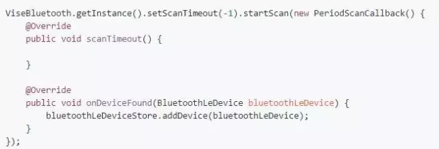 扫描包含三种方式,第一种方式是直接扫描所有设备,可以设置循环扫描,也可以设置超时时间,扫描到的设备可以添加到 BluetoothLeDeviceStore 中统一进行处理,使用方式如下: