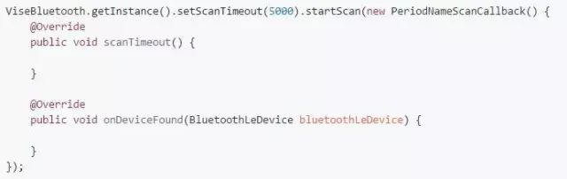 第三种方式是扫描指定广播名的设备,同第二种方式类似,也需设置超时时间,扫描到指定设备后也会停止扫描,使用方式如下: