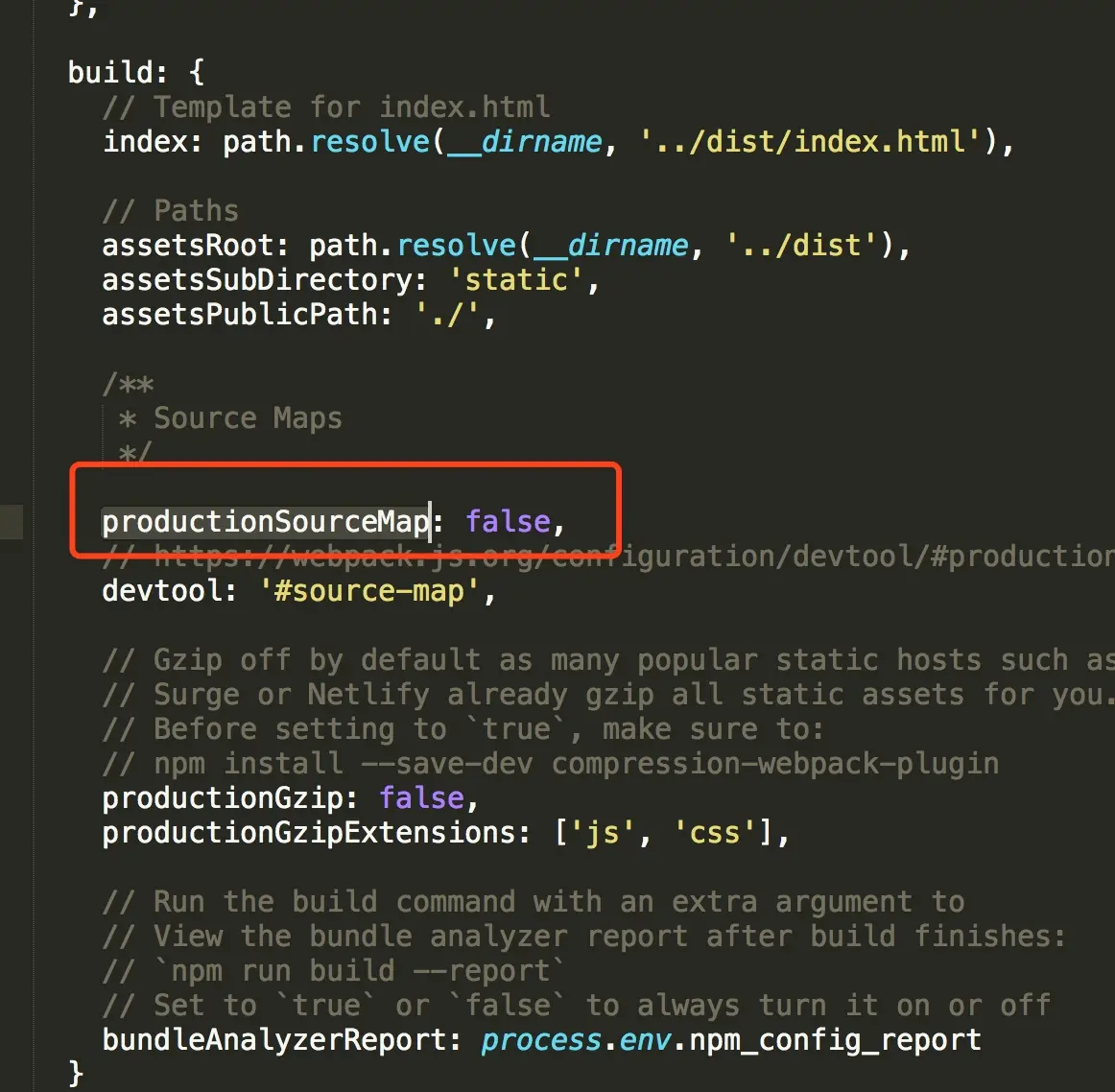 打开/config/index.js文件,找到build {}的配置下的productionSourceMap改成false就不会生成.map文件啦