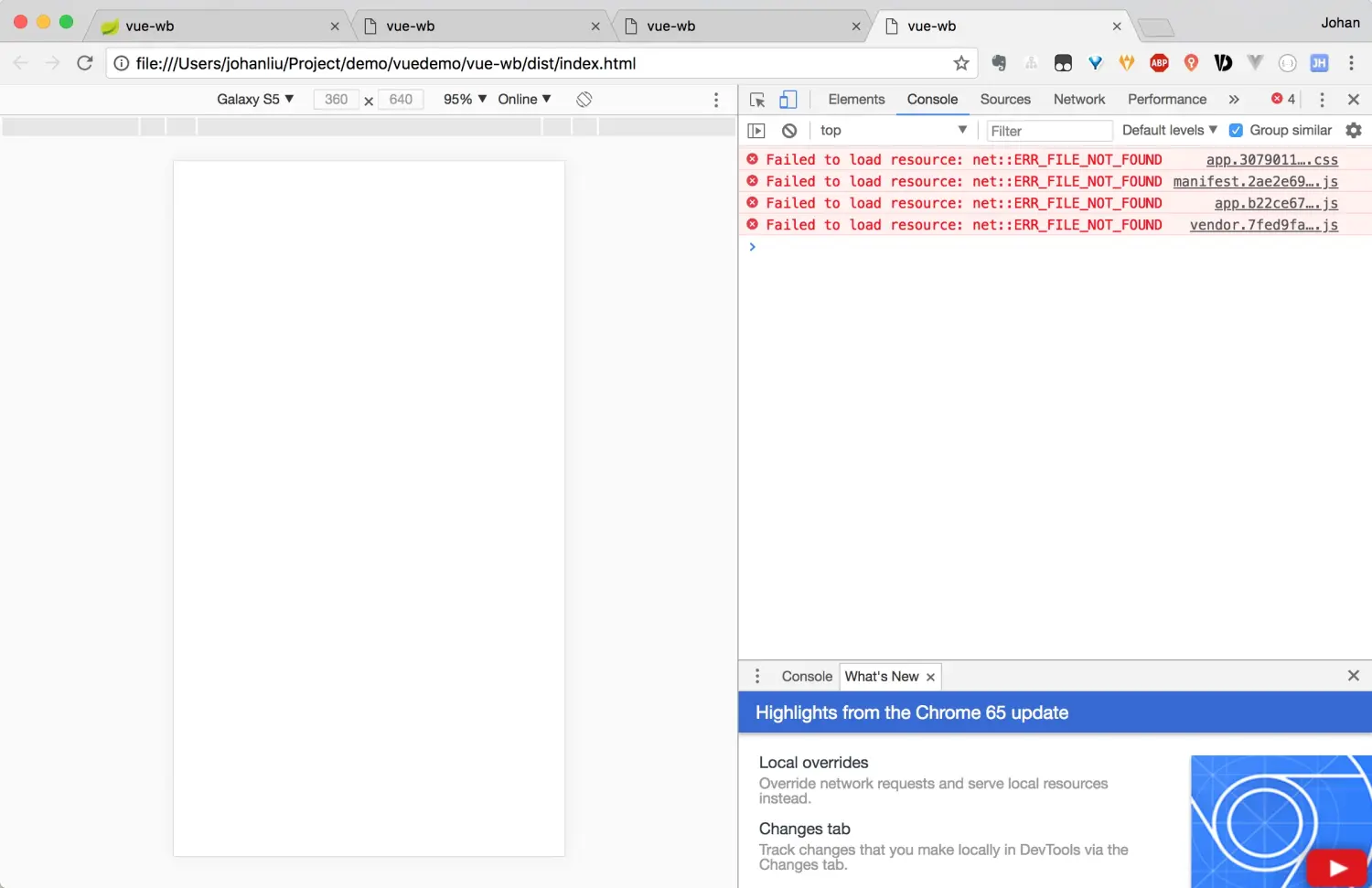 一片空白并且报了ERR_FILE_NOT_FOUND的错误,没有找到css和js文件。用编辑器打开文件后可以看到,这几个文件的路径确实有些问题,于是在路径前加上一个.号后发现打开页面不再是一片空白了。