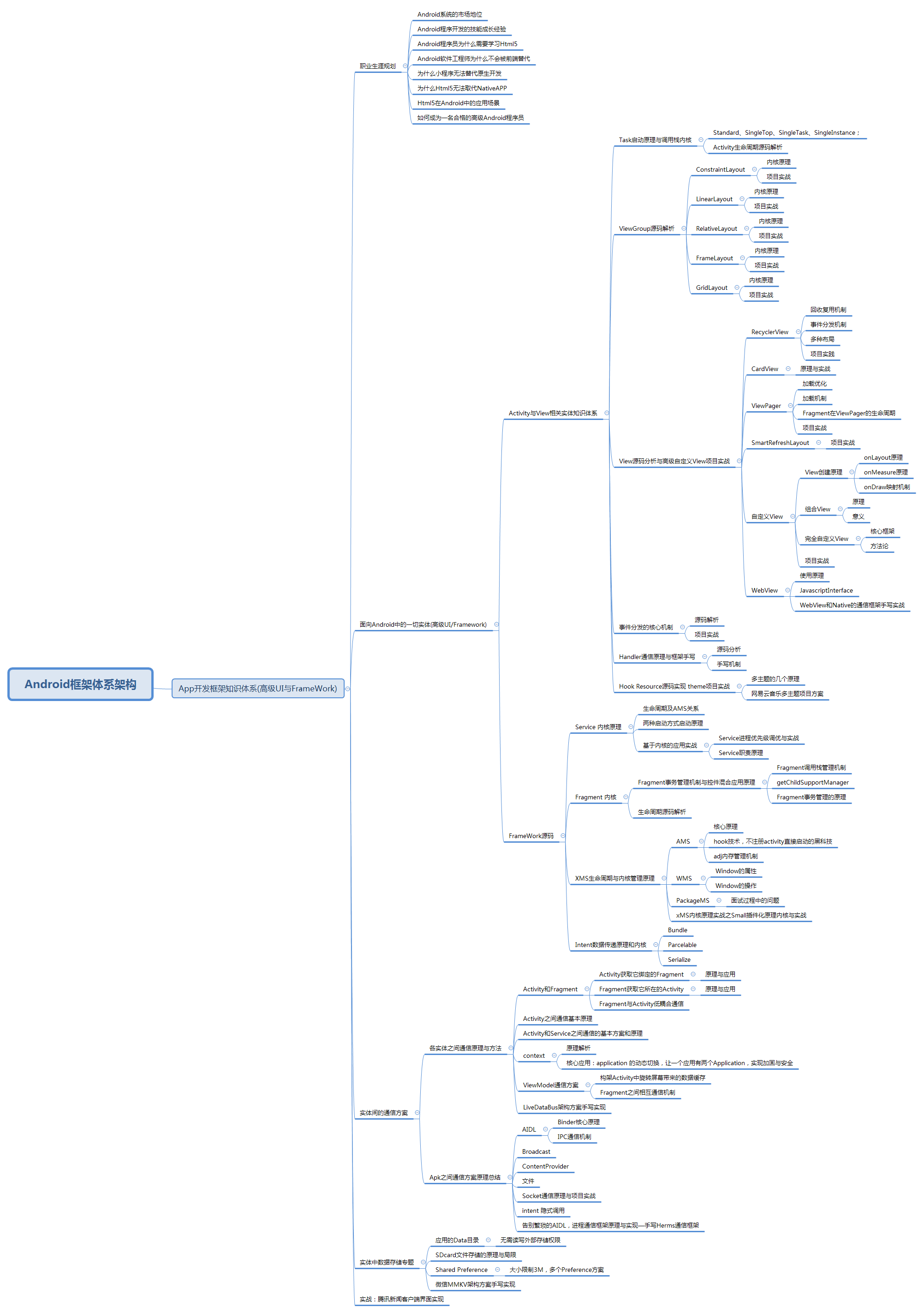 最后看一下《Android框架体系架构(高级UI+FrameWork源码)》学习需要的所有知识点的思维导图。在刚刚那份学习笔记里包含了下面知识点所有内容!文章里已经展示了部分!如果你正愁这块不知道如何学习或者想提升学习这块知识的学习效率,那么这份学习笔记绝对是你的秘密武器!
