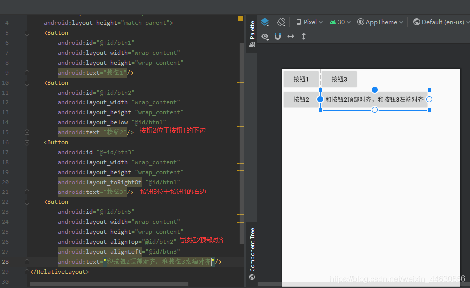 android:layout_toLeftOf | 将该控件的右边缘与给定ID的控件左边缘对齐,将该组件放在其他某个组件左边 |