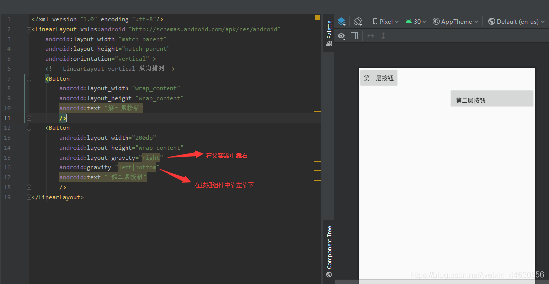 android:layout_gravity | 为容器内的控件设置该控件在父容器中的对齐方式 (当父容器线性设置为 vertical 纵向时,则只有设置与左右相关的值才起作用,ex:left、right当父容器线性设置为 horizontal 横向时,则只有设置与上下相关的值才起作用,ex:top、bottom) |