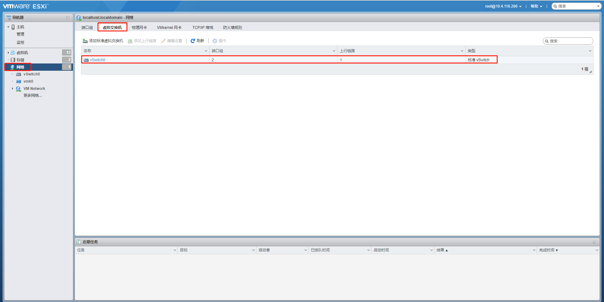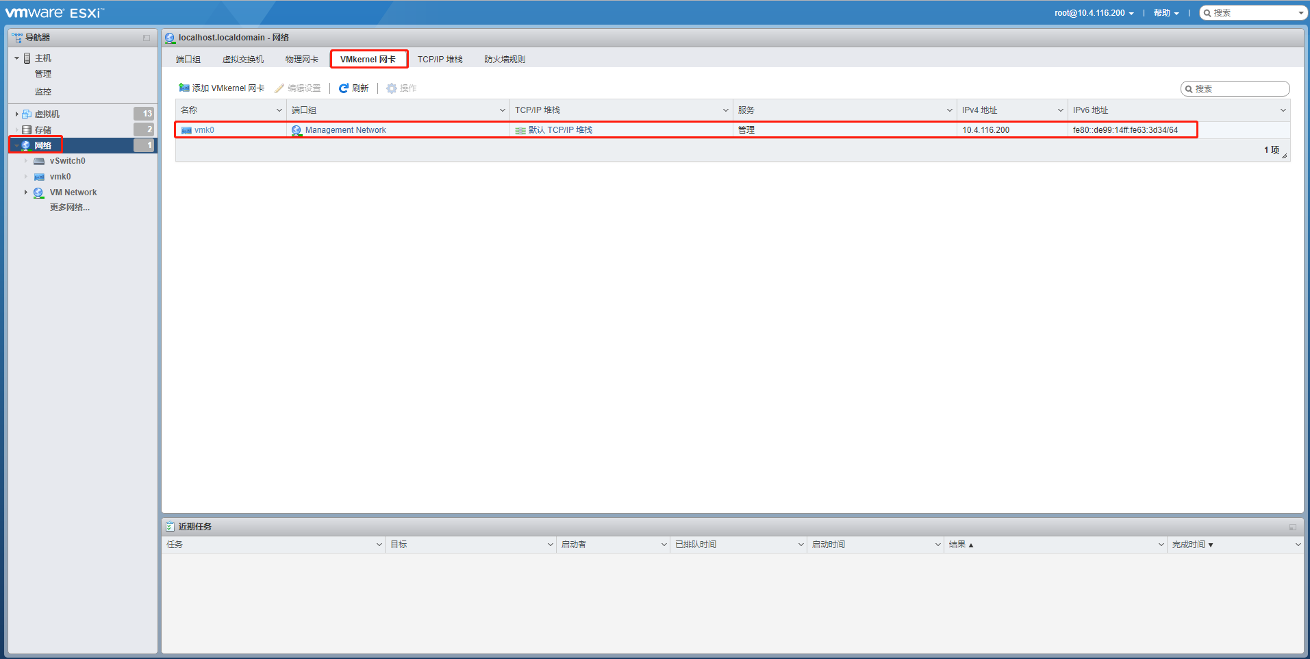 VMkernel网络适配器是ESXi用来主机管理的,下图中vmk0的IP是10.4.116.200,也就是说我们可以通过这个IP(http://IP)访问这台ESXi和它里面的资源;