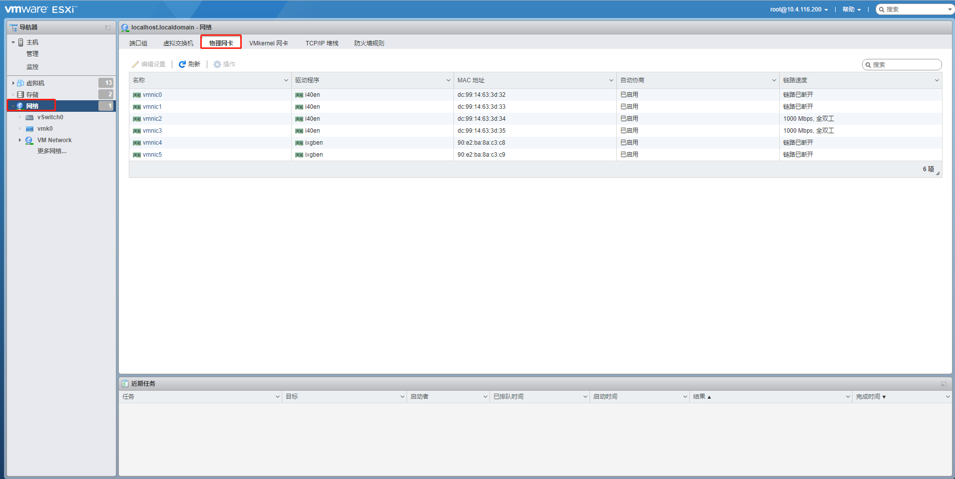 2、在“网络”->“物理网卡”界面看到物理设备上所有的网卡;