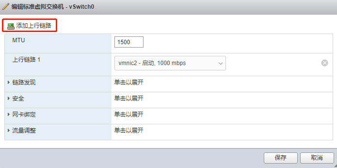 编辑一下vSwitch0,可以看到这里有个“添加上行链路”的按钮,意思就是说可以在这里添加多个上行链路以达到故障冗余的效果: