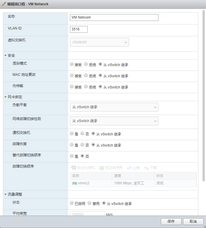 点进去可以看到VM Network的详情,虚拟交换机直使用了vSwitch0,然后安全、网卡绑定、流量调整全部从vSwitch继承下来: