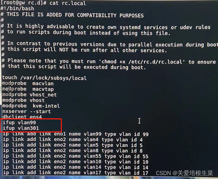 如果想要下次重启vlan自启动,则可以在 /etc/rc.d/rc.local中直接添加一行:ifup vlanxx,如下图: