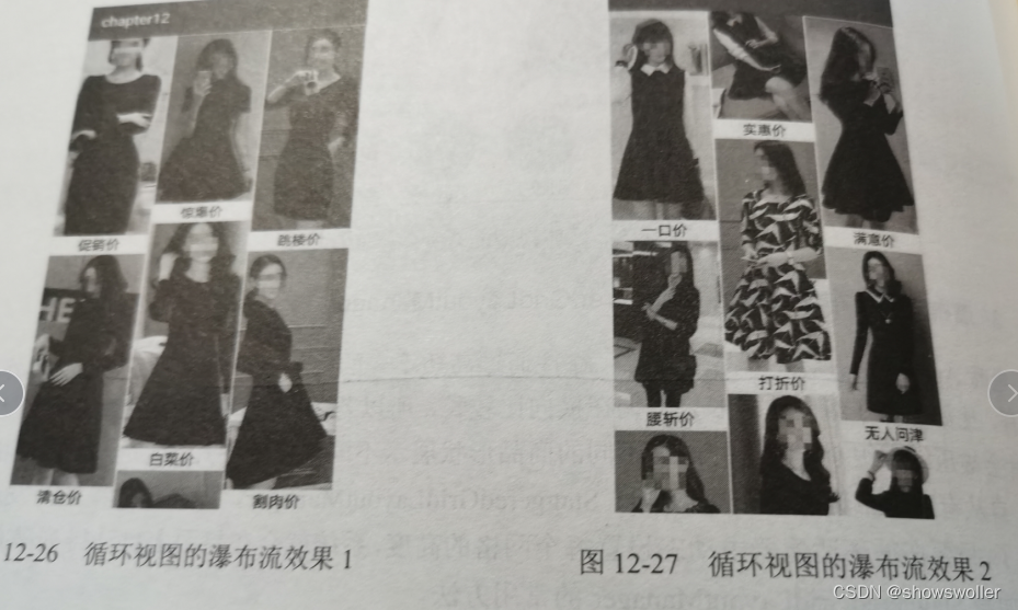 电商App在展示众多商品信息时,往往通过高矮不一的格子展示,因为不同商品的外观尺寸不一样,所以若用一样规格的网格展示,必然有的商品会被压缩的很小,所以根据不同的商品形状展示不同高度的图片,就是瀑布流网格的应用场合