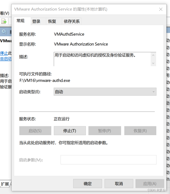第二步:停止VMware Working 服务,关闭VMware程序,找到VMAuthdService服务,点击属性,修改启动类型为:自动(延迟启动)