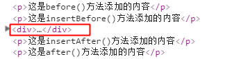 $("div").before("<p>这是before()方法添加的内容</p>");//在div元素前面插入段落