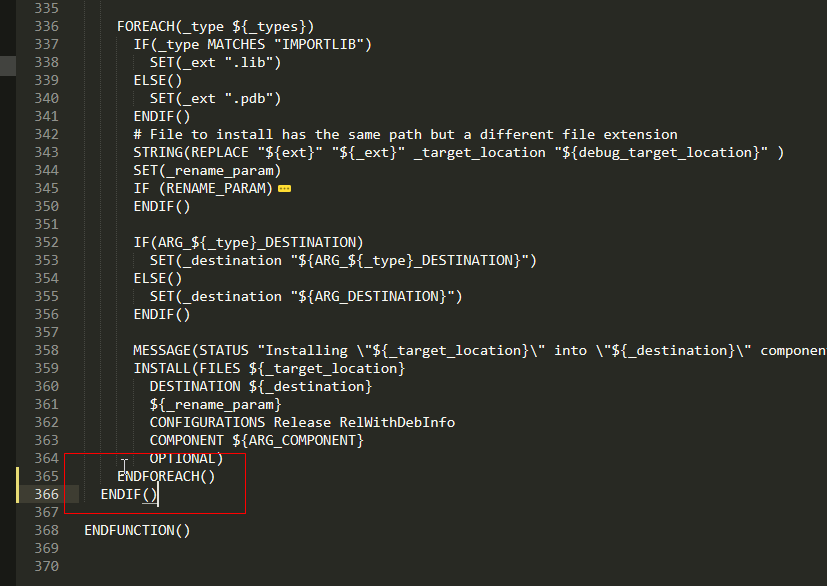把365行的ENDIF和366行的ENDFOREACH换个位置就能成功配置了