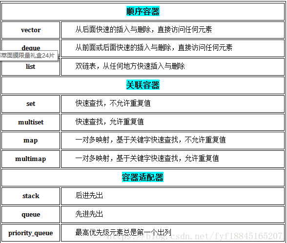 STL对定义的通用容器分三类:顺序容器、关联容器和容器适配器。