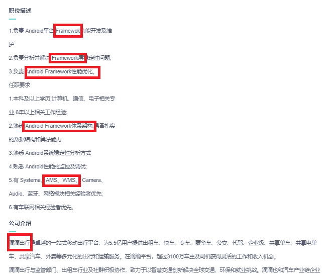 首先我们可以通过上面 滴滴出行 的 招聘信息 中了解到车载开发所必须要学会的就是 Framework 源码 的学习;而 Framework 源码 中又包含了 Handler 、Binder 、AMS、WMS 等 重点学习对象