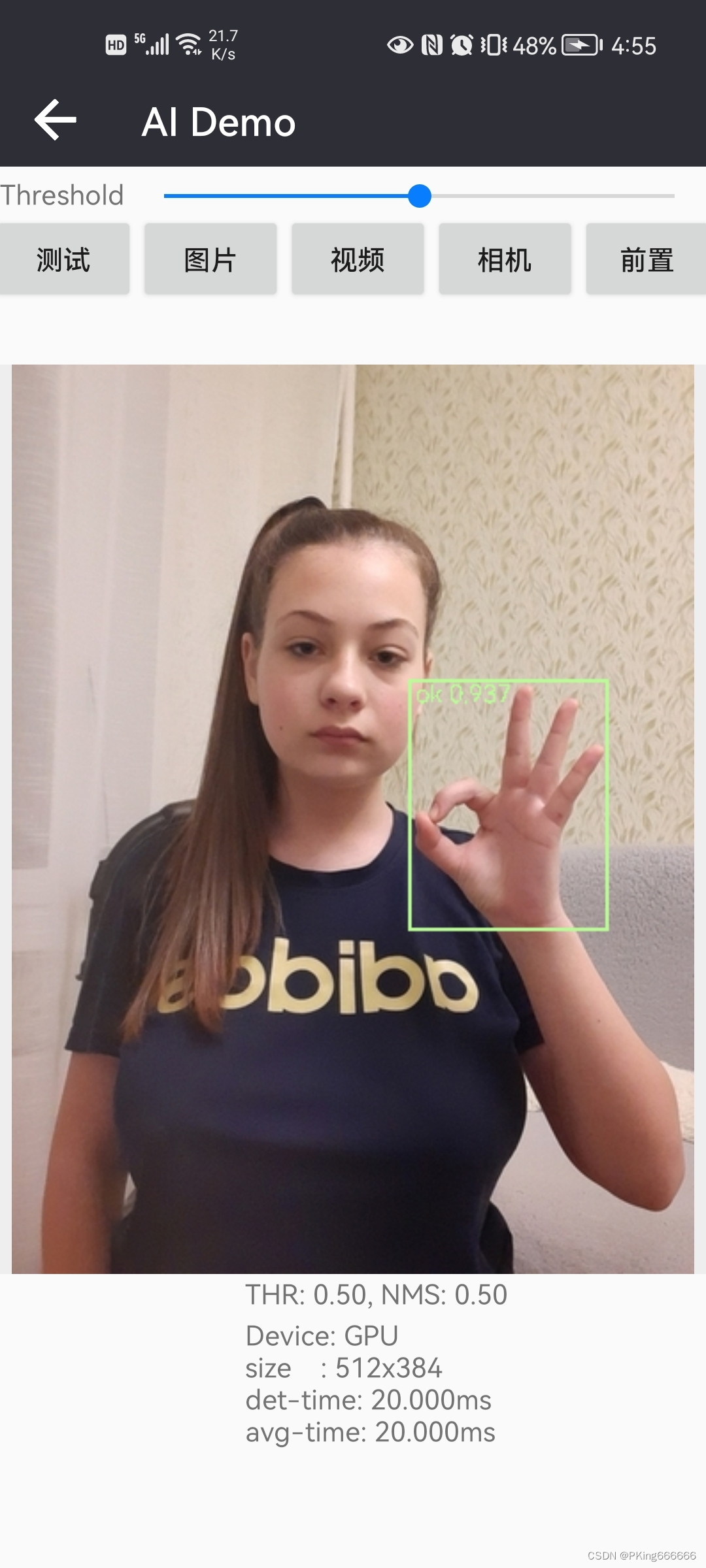 APP在普通Android手机上可以达到实时的手势识别效果,CPU(4线程)约30ms左右,GPU约25ms左右 ,基本满足业务的性能需求。