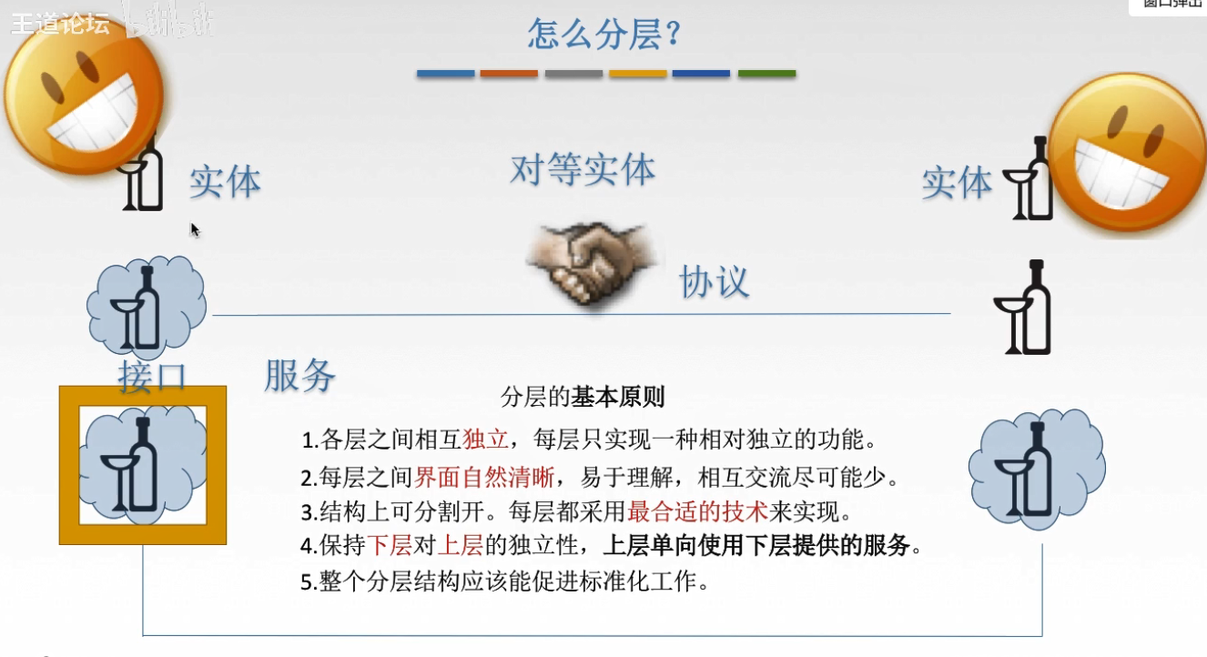 (2)服务上的交流和接口仅仅在相邻两层上具有,虽然上层可享受下层或者下下层的服务,但是上层和下下层之间没有借口,且下下层对上层不提供服务,下层仅对上层提供服务