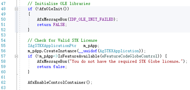 第54~60行是执行STK License检测,不过根据代码看m_pApp是局部变量,这个License检测应该不是应用运行所必须的,有待后面验证。