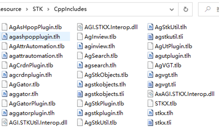 首先可以看出STK是基于COM编程的(#include <afxdisp.h>),注意上图的下部是STK对外提供的接口信息,定义这些接口信息的文件在第一回(补充链接……)中提到的外部Include文件夹(CppIncludes)中,由STK默认安装的实例代码提供。该文件夹中有33个文件(其中.tlb文件13个,.tlh文件13个,.tli文件4个,.dll文件3个),如下图: