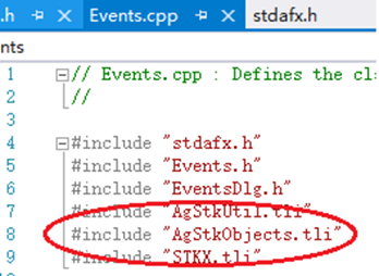 在Events.cpp中,包含了三个STK的.tli(C++源代码)文件,这个引用非常重要,相当于把IDL(接口)有关的方法定义直接嵌入了项目代码,因为c/c++需要事先对函数声明,如果没有这个引用,则在项目生成时会报告链接错误。如下图: