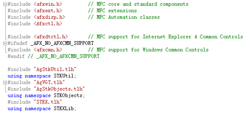 各文件的意义请自行参考COM编程中有关IDL文件的内容,其中*.tlb为IDL文件编译后的库文件,可用于其他编程语言;*.tlh为头文件;*.tli为c/cpp源代码。其中agstkobjects.tlh文件有79520行!!!,这些文件应该都是MFC的IDL文件编译器自动生成的,在后续如果涉及到再具体了解。