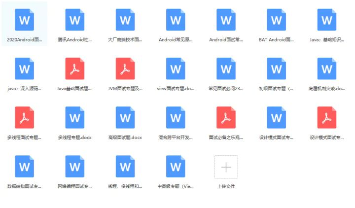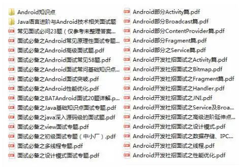 下面是小编自己收录了一些Android进阶资料,包含**Android架构视频+BATJ面试专题PDF+学习笔记等,由于篇幅有限,这里以图片的形式给大家展示一部分。 如果你有需要的话,可以简信我【666】领取,**希望能够帮助到大家。