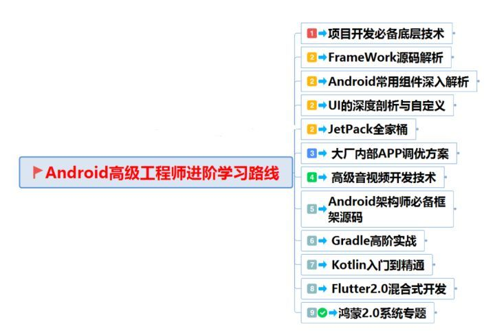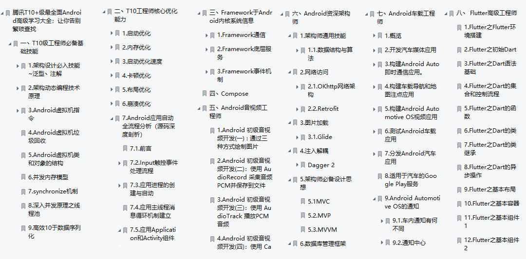 在深耕技术前,首先要给自己制定一个成长曲线图,按照路线来合理的学习;不要东拼西凑的去学,那就是在浪费自己的时间,而且很容易忘去;下面是对标腾讯 T10 级 Android 高级进阶学习路线,为了让你能够告别繁琐的技术需求而制定,里面记录的都是 Android工程师必备技能和现主流技术的学习路线