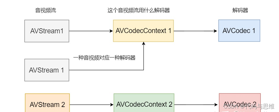 AVStream和AVpacket中都有index字段用于区分不同的码流(视频、音频、字幕等),AVFormatContext中包含输入的AVStream数组用于记录各个码流,nb_streams记录输入码流的数量。AVCodecContext记录着AVStream需要用那种解码器来进行解码。