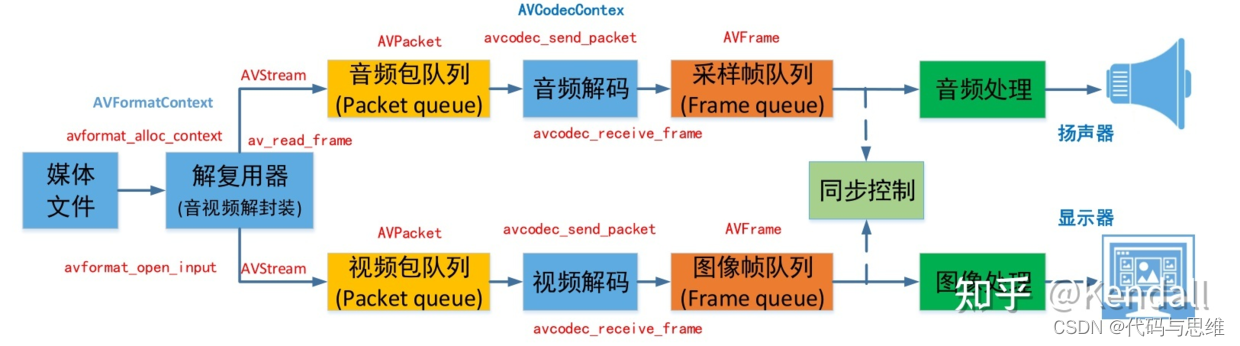 (3)解码(h264,mpeg2,aac,mp3) AVStream是存储每一个视频/音频流信息的结构体。 AVCodecContext: 编解码器上下文结构体,存储该视频/音频流使用解码方式的相关数据。 AVCodec: 每种视频(音频)编解码器(例如H.264解码器)对应一 个该结构体。