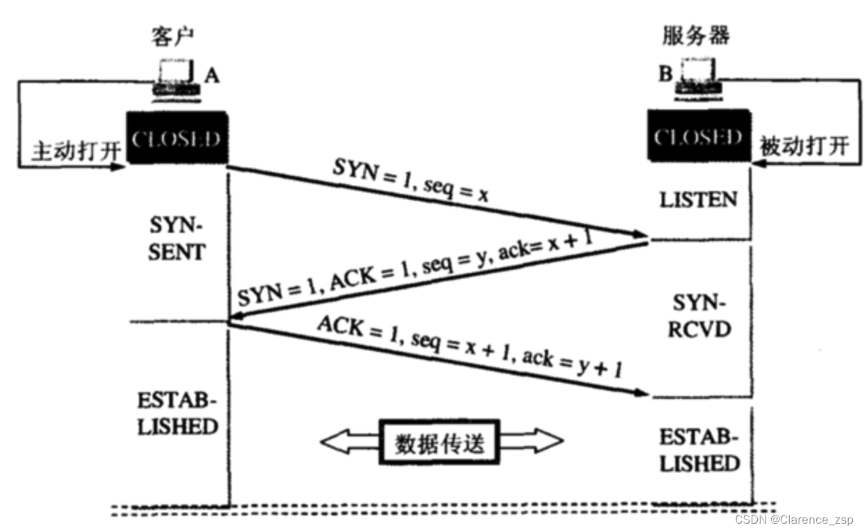最初两端都是CLOSED状态,A主动打开连接,而B被控打开连接