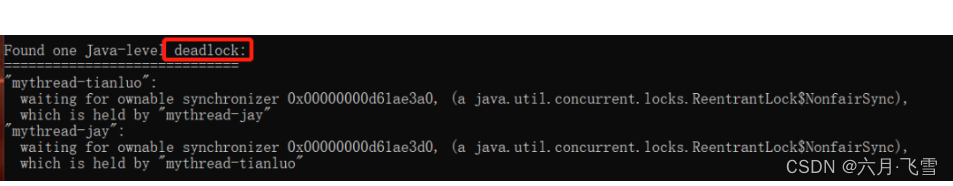 mythread-tianluo 等待这个锁 “0x00000000d61ae3a0”,这个锁是由mythread-jay线程持有。