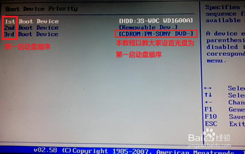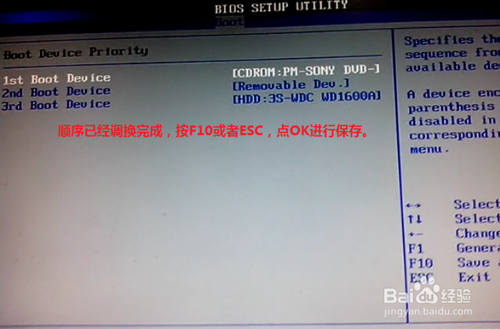 第四步之后进入了“Boot Device Priority”菜单,此菜单呈现出了第一启动盘的顺序。按方向键进行选择第一项之后按回车键出现了一个“Opt ions”框,选择CDROM则可以发现“Boot Device Priority”界面的菜单顺序已经调整和更改。最后按“F10”或者“ESC”键会出现一个提示框,选择“OK”进行保存