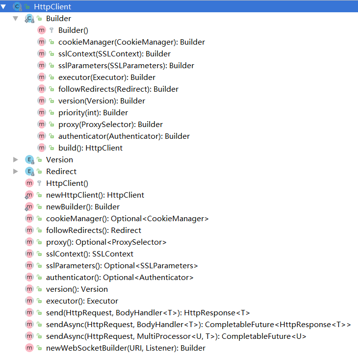 API中Builder部分用来构建客户端的配置,send相关的几个方法是进行请求发送,不同的是Async是异步操作。其他的基本是客户端的参数配置信息(包括代理,线程,版本,SSL,cookie等),同时也提供了socket支持。