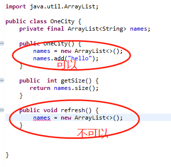 在之前java 开发的认知中,final 修饰的变量一旦初始化,就不能被修改,如果是类变量,只能在构造方法中初始化,在其他方法中如果初始化,编译器也会报错,IDE也会拒绝编译。如下: