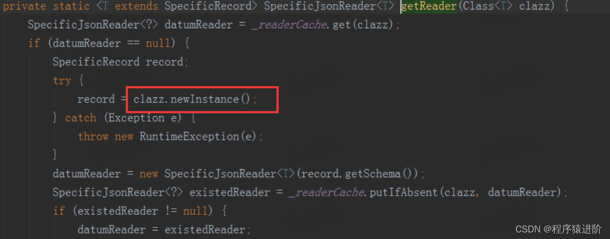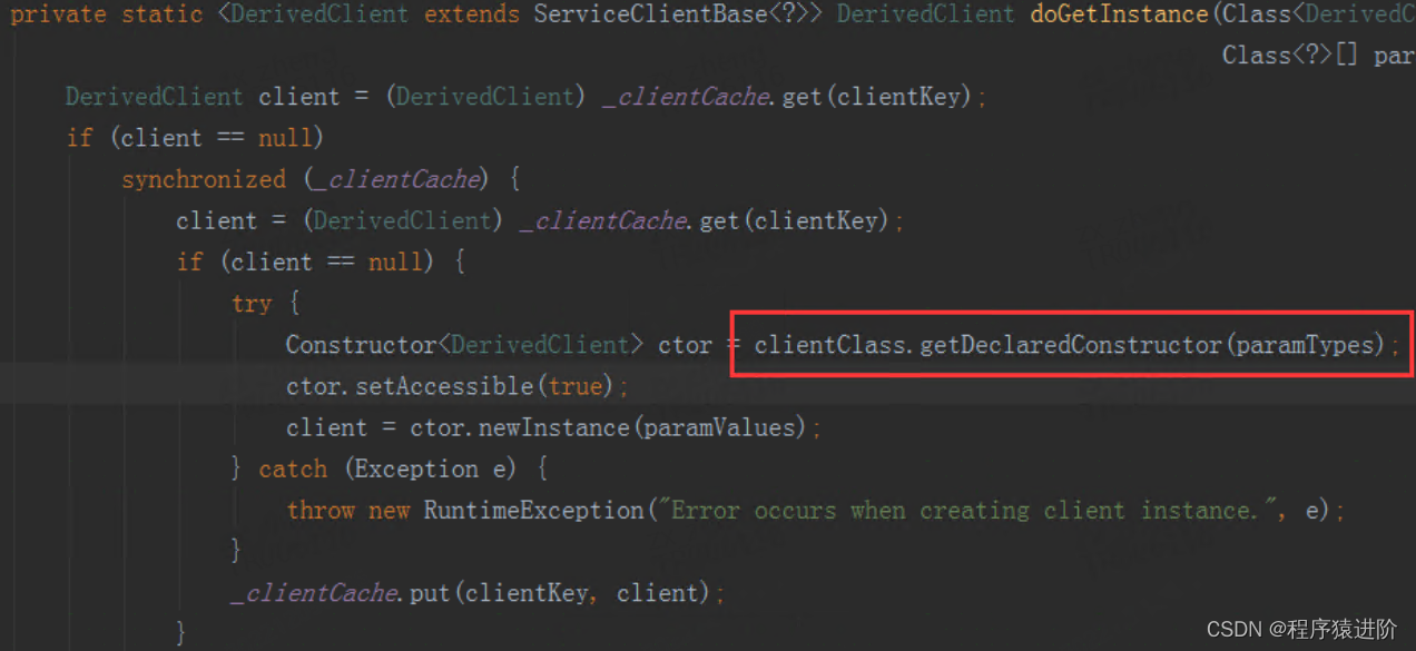 通过上图可以看出在调用底层接口时都是通过反射的方式获取类的实例, 查看com.ctriposs.baiji.rpc.client.ServiceClientBase的getInstance方法代码实现可以确认。