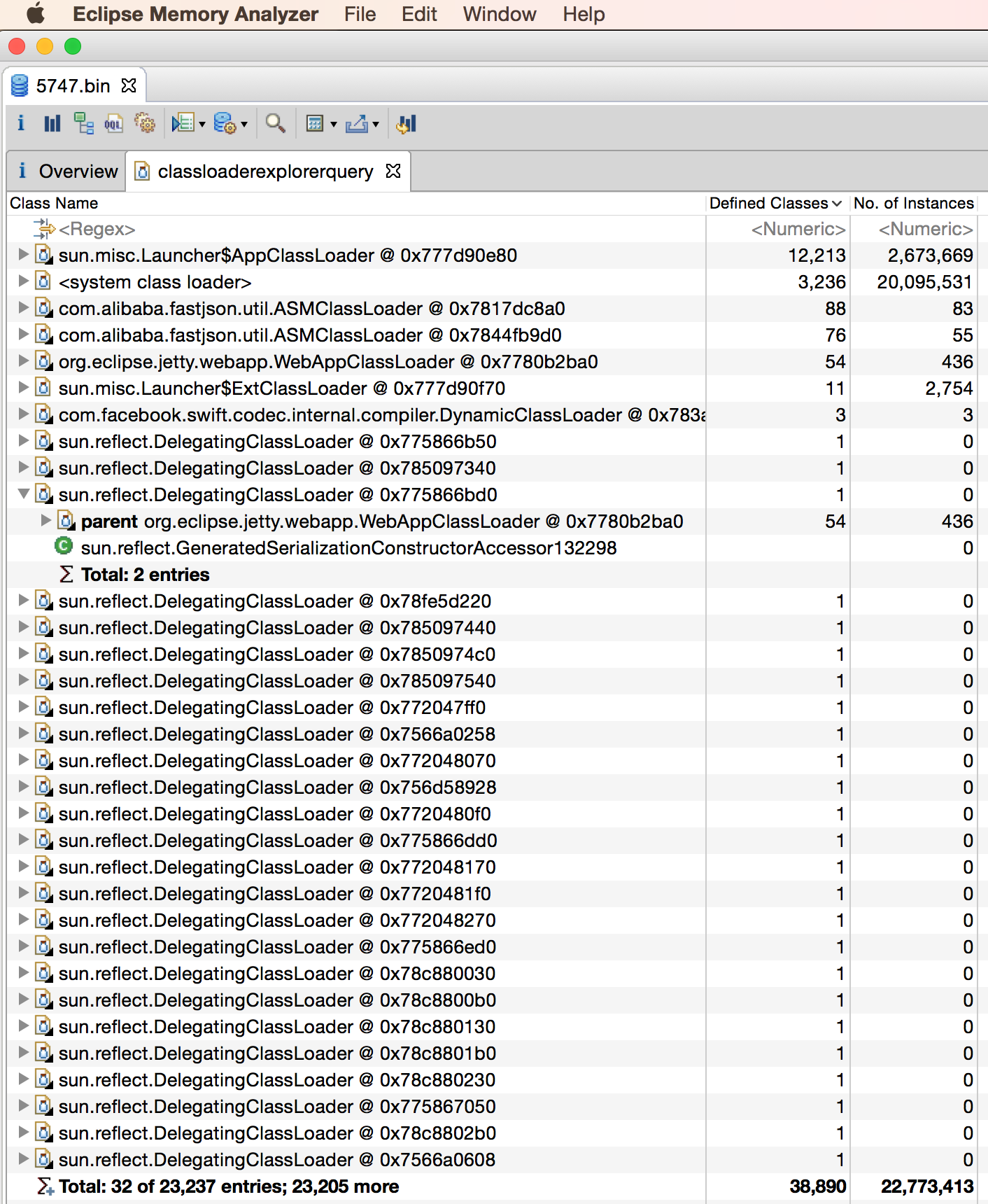 1、“Loaded sun.reflect.GeneratedSerializationConstructorAccessor10037 from __JVM_DefineClass__”,这个提示是很明显的,虽然PermGen满了,但是是被这个类填充的,不是我们的业务类,所以,我们不应该怀疑是我们的业务类被增强而产生了多个;因为没有我们的业务类被增强并被Loaded的提示;所以,只要找出这个类加载的原因就好了;