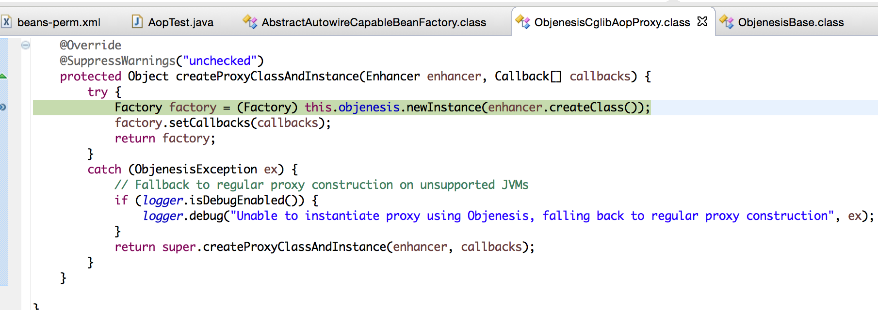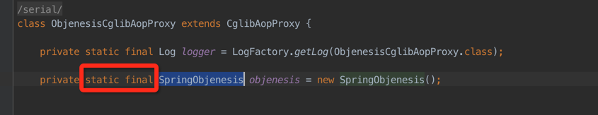 原来官方推荐单例使用的,而Spring4.1.1中用错了,非单例的;CglibAopProxy是通过ProxyFactory来生成的,因此每次都会new一个,所以Objenesis也会new一个。试着用Spring的更高版本,发现从4.2.4开始,Spring已经修正了这个Bug,改成静态的了。