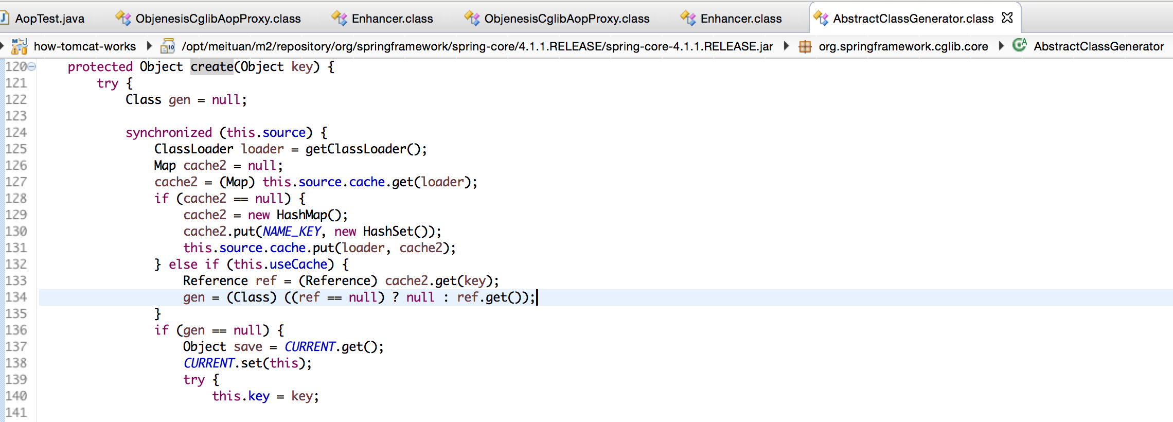 我们可以看到,Enhancer每次都调用createClass()方法,但是,生成类时使用了cache,保证同一个类加载器里面,一个类同样的增强配置时,只有生成一个类。