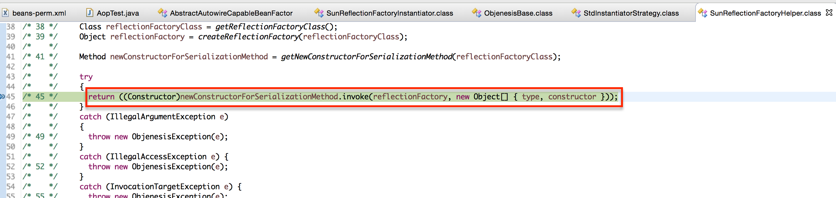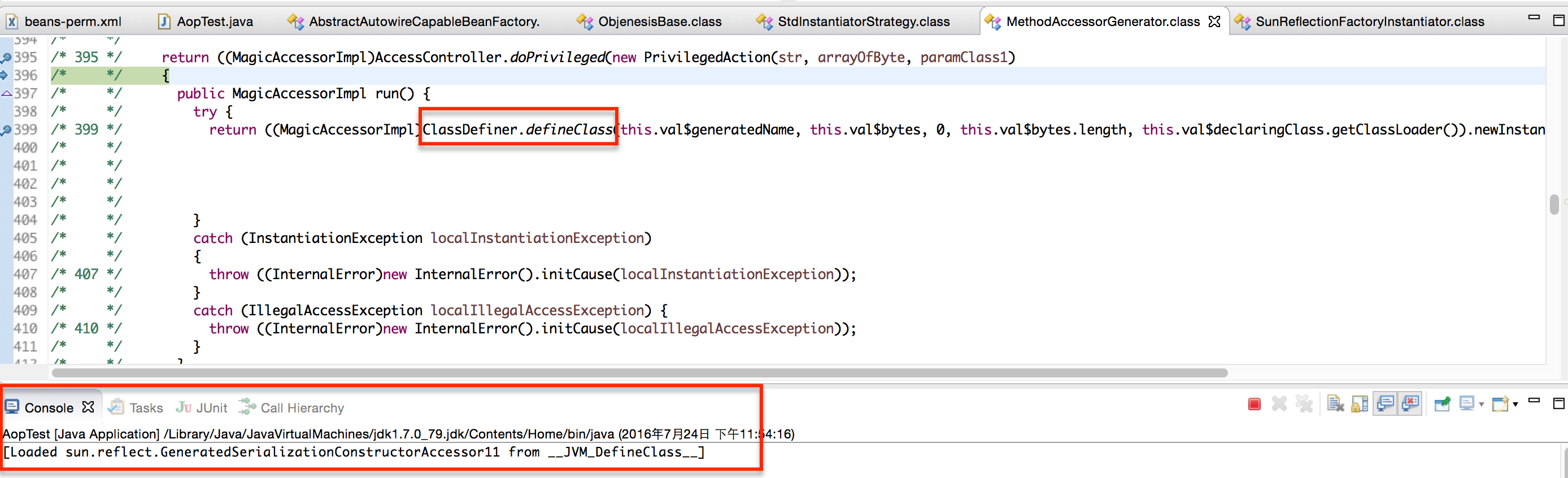 第二个阶段,在找不出根本原因的情况下,化繁为简,通过简单的演示代码,复现问题,并通过Debug的细致跟踪,找出Spring 4.1.1在“ObjenesisCglibAopProxy”中,使用“ObjenesisStd”实例化类时的Bug。