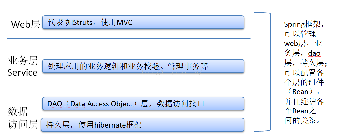 SSH(struts+Spring+hibernate)中Spring实际是一个容器框架,管理各个层,可以配置各种Bean(action/service/dao...),并维护Bean之间的关系。