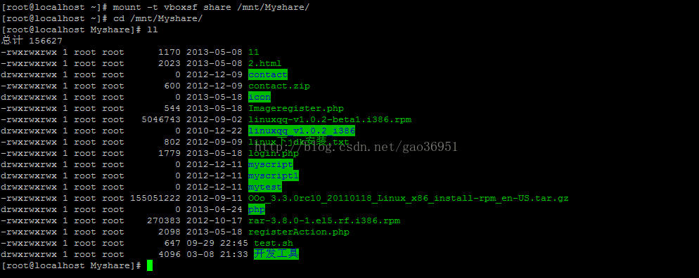 下图的文件都是从主机上共享过来的文件,详细文件共享配置请看http://blog.csdn.net/gao36951/article/details/19608583