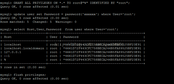 mysql>GRANT ALL PRIVILEGES ON *.* TO 'root'@'%' IDENTIFIED BY '******' WITH GRANT OPTION;