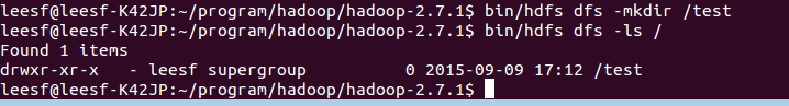 bin/hdfs dfs -mkdir /test,表示在hdfs的根目录下建立了一个test目录