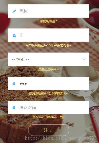 不符合验证要求时,会显示错误提示的message,并且禁用提交按钮,提示信息的颜色字体等等都可以重写css来设置,效果展示如下: