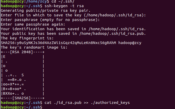 exit # 退出刚才的 ssh localhost cd ~/.ssh/ # 若没有该目录,请先执行一次ssh localhost ssh-keygen -t rsa # 会有提示,都按回车就可以 cat ./id_rsa.pub >> ./authorized_keys # 加入授权